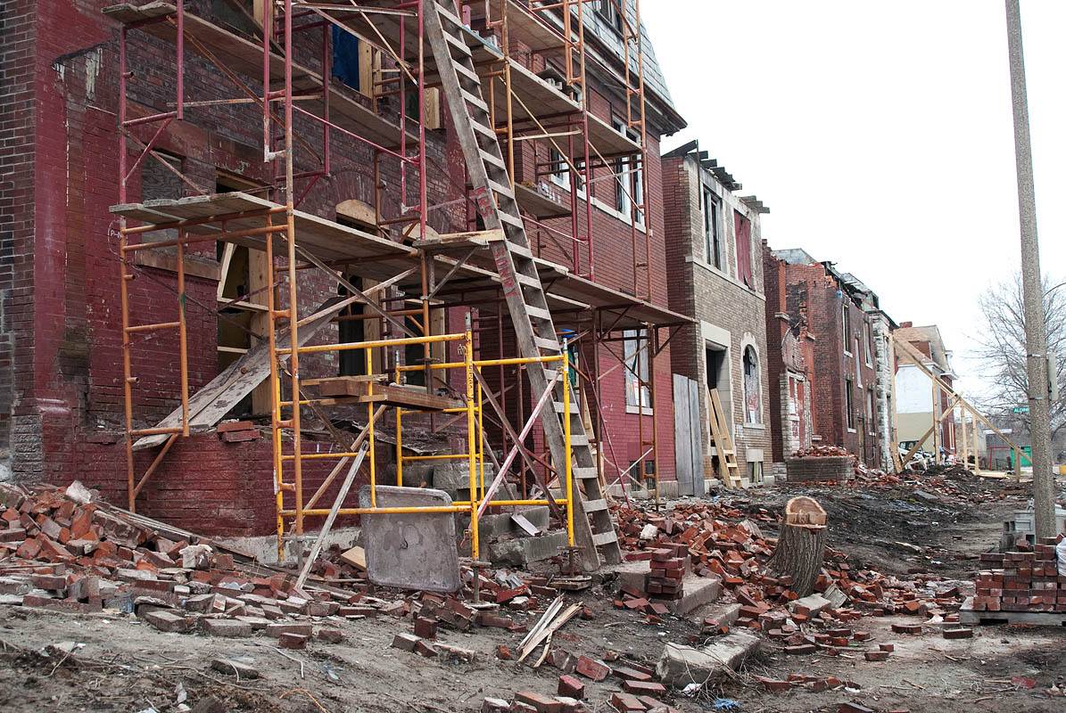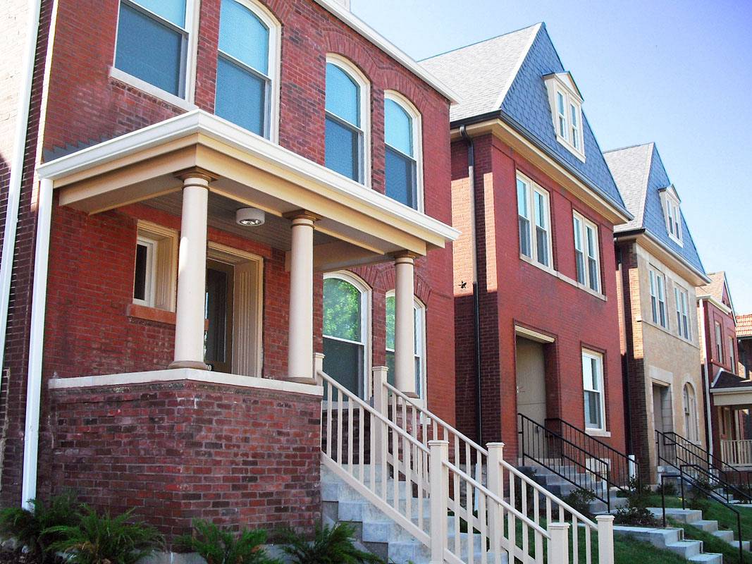 Prior to renovation, Dick Gregory Place in St. Louis’ Greater Ville neighborhood looked like far too many blocks of North St. Louis: broken or boarded windows, fire damage, gaping holes in brick walls and roofs, some roofs entirely missing. Once stately homes (some vacant for decades) were truly on their last legs. Enter developers RISE Community Development (formerly RHCDA) and Northside Community Housing, who, with financing from federal and state historic preservation tax credits, low-income housing tax credits, HOME funds, and other financing, rescued these buildings, creating 40 units of affordable housing and 2 commercial spaces. Comprising 15 historic buildings and 2 new apartment buildings, the Dick Gregory Place development involved extensive masonry, framing, and roofing improvements, new plumbing, heating/cooling, and electrical systems, flooring, drywall, and appliances. Site improvements included new perimeter fencing, sidewalks, and landscaping. Addressing nearly every derelict building on the street, the project is considered a model of “critical mass” redevelopment and historic preservation for older urban neighborhoods.
