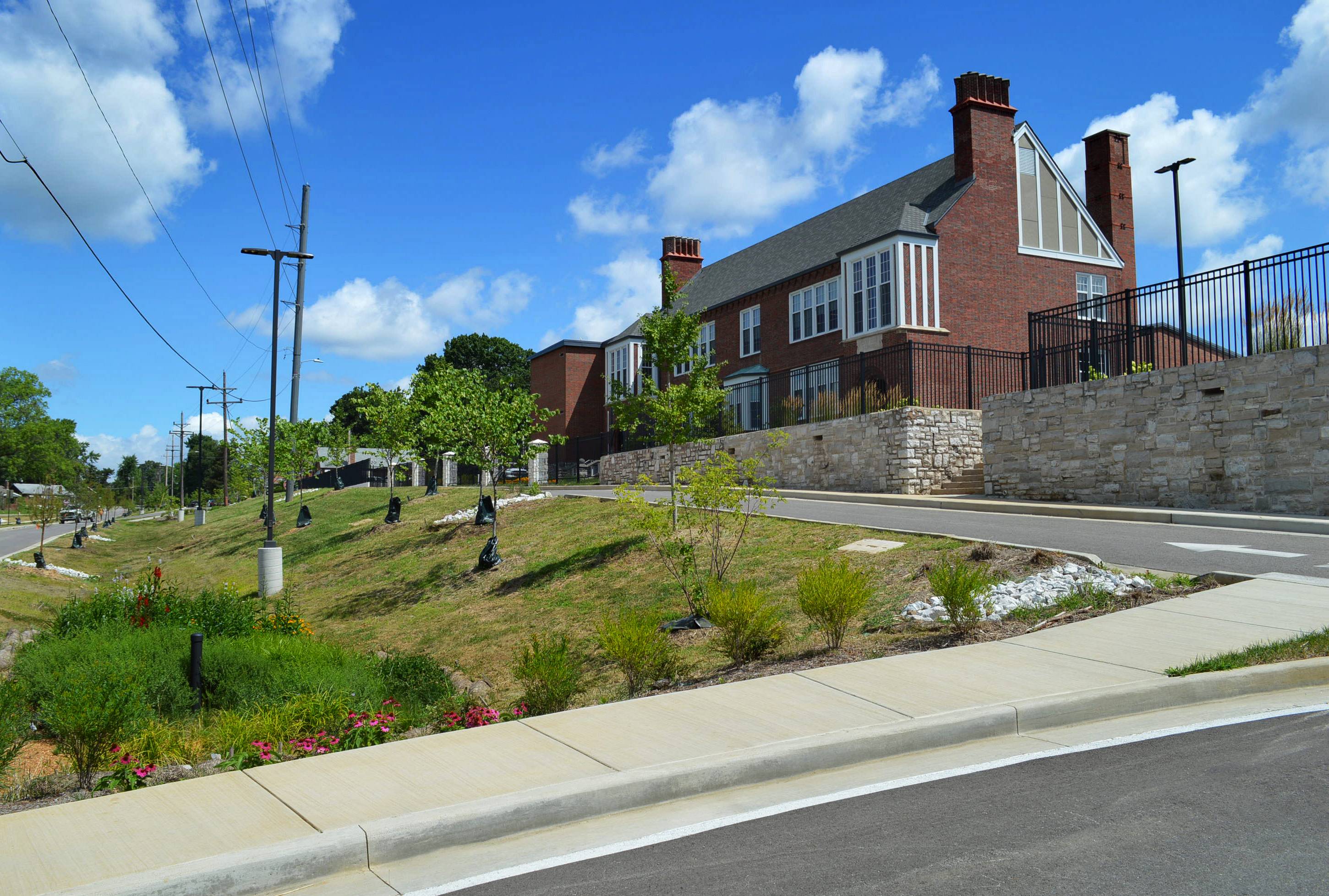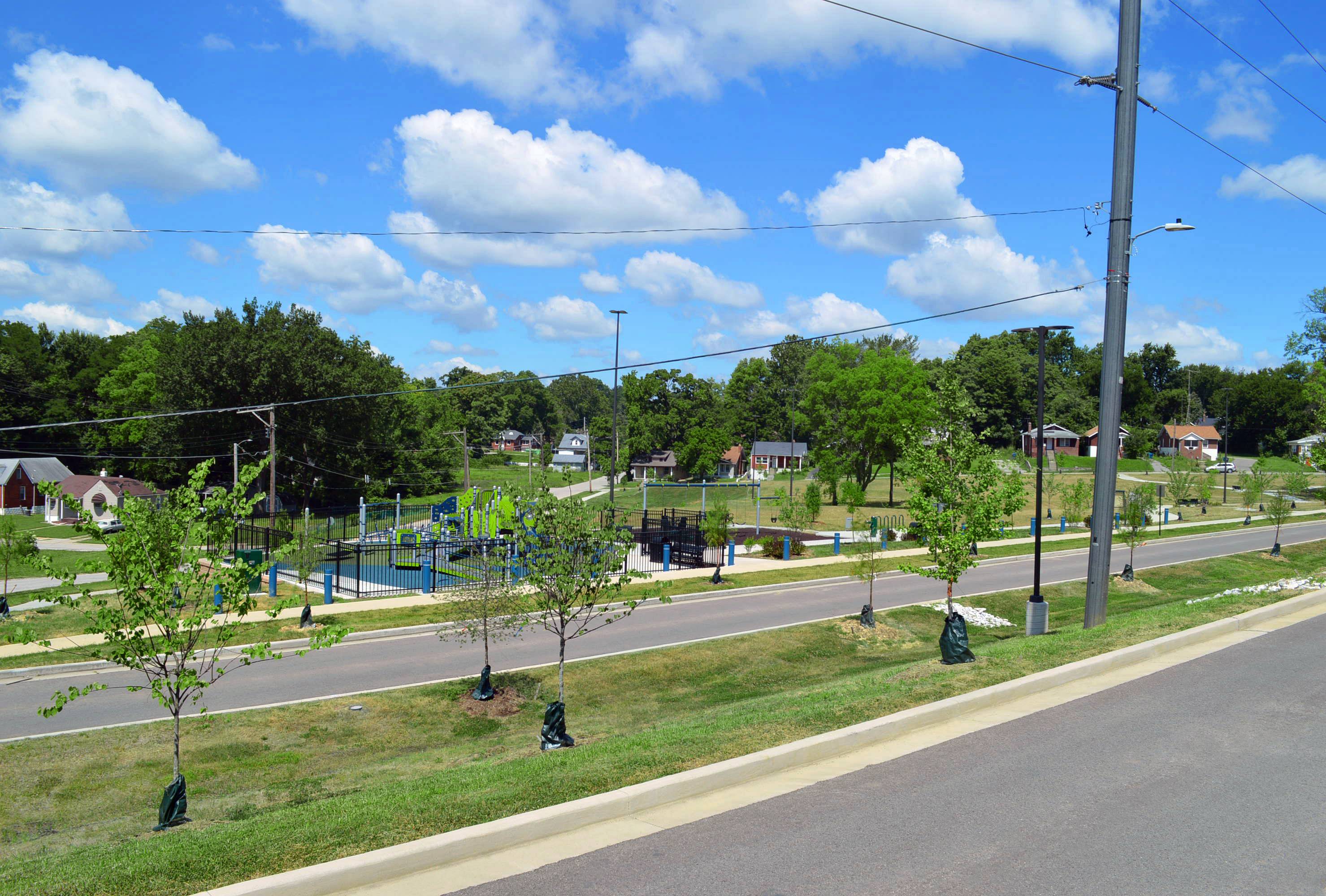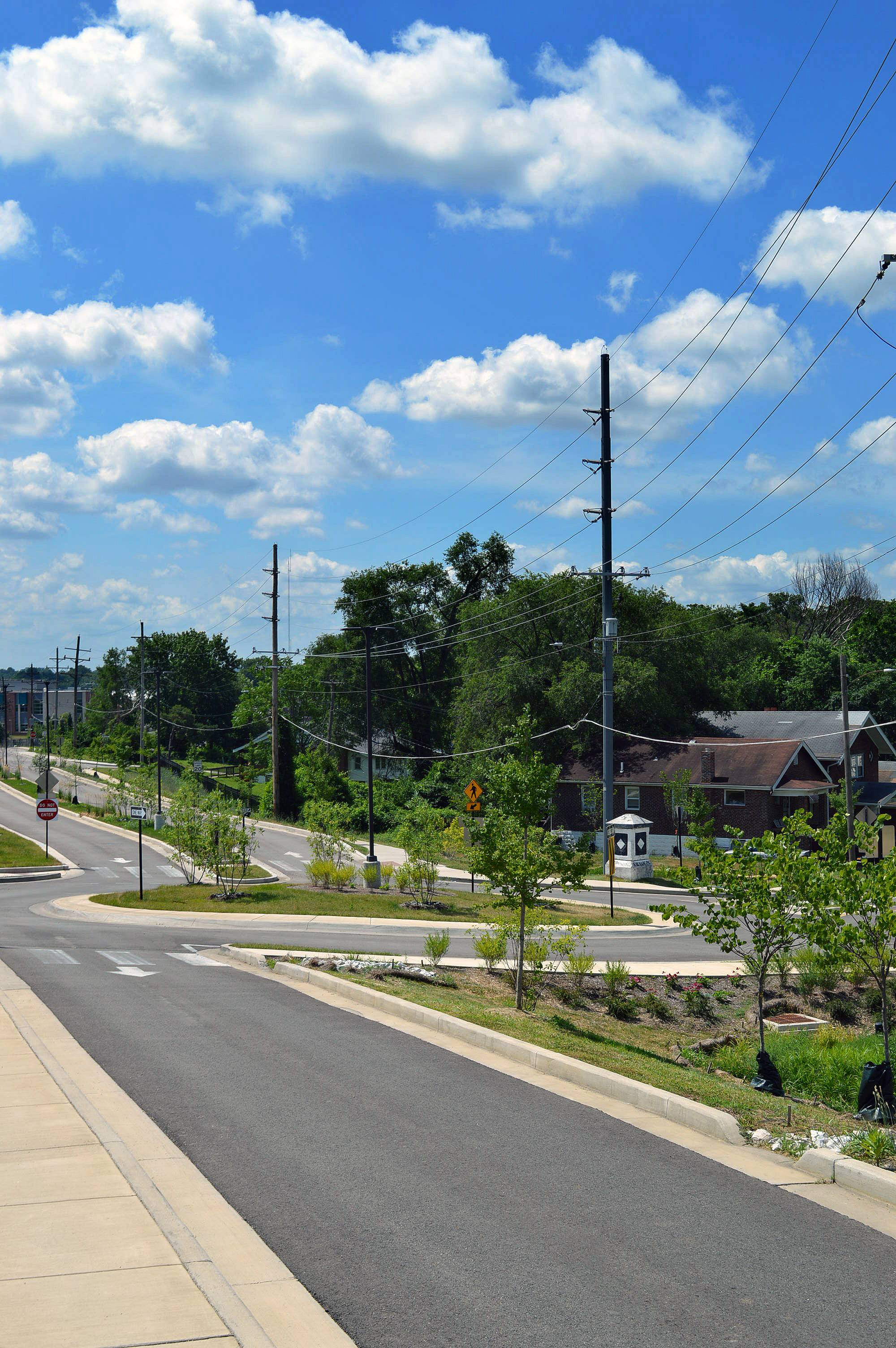 Pasadena Boulevard in the St. Louis suburb of Pine Lawn had a few problems: no sidewalks for children walking to and from the nearby school, vacant buildings, and stormwater runoff. Financed by a grant from Metropolitan Sewer District’s Project Clear program and a private family donation, the Heart of Pine Lawn/Northwoods Pointe public improvements project involved replacement of approximately ½ mile of Pasadena Boulevard and installation of a center median, roundabout, new sidewalks, rainscaping and 9 bioretention areas. MSD's Project Clear program aims to reduce the stress of stormwater on local sewer systems and flooding/sewer backups for nearby homes by retaining water where it lands. Related to this project was the creation of Pine Lawn Community Park, which involved demolition of vacant buildings, sitework, new sidewalks, retaining walls, playground, water fountain, benches, site electric, lighting, fencing, bollards, monument sign and landscaping. The project received the St. Louis Business Journal’s Building St. Louis Awards—Public/Private Project $10 Million or Less category.