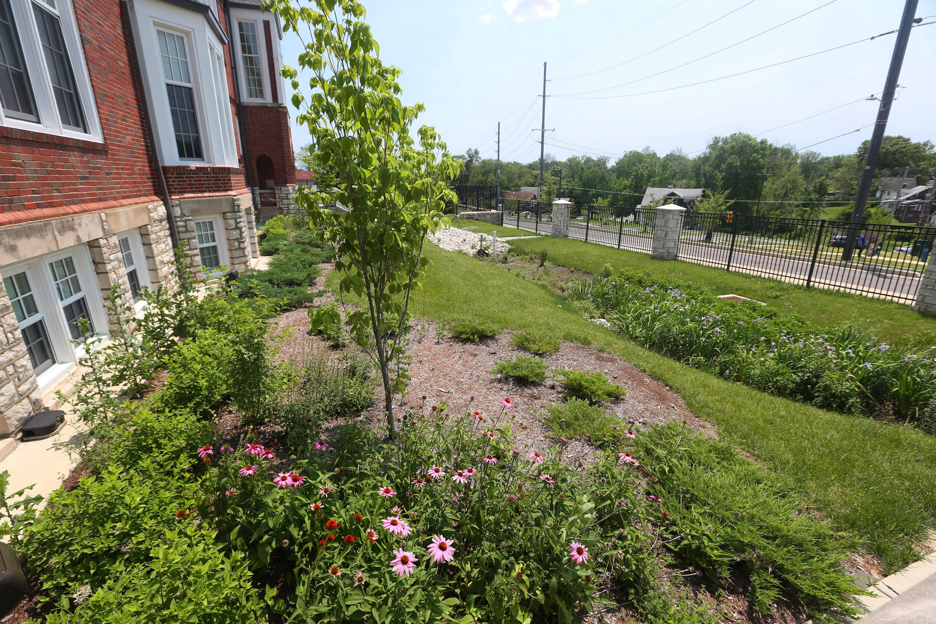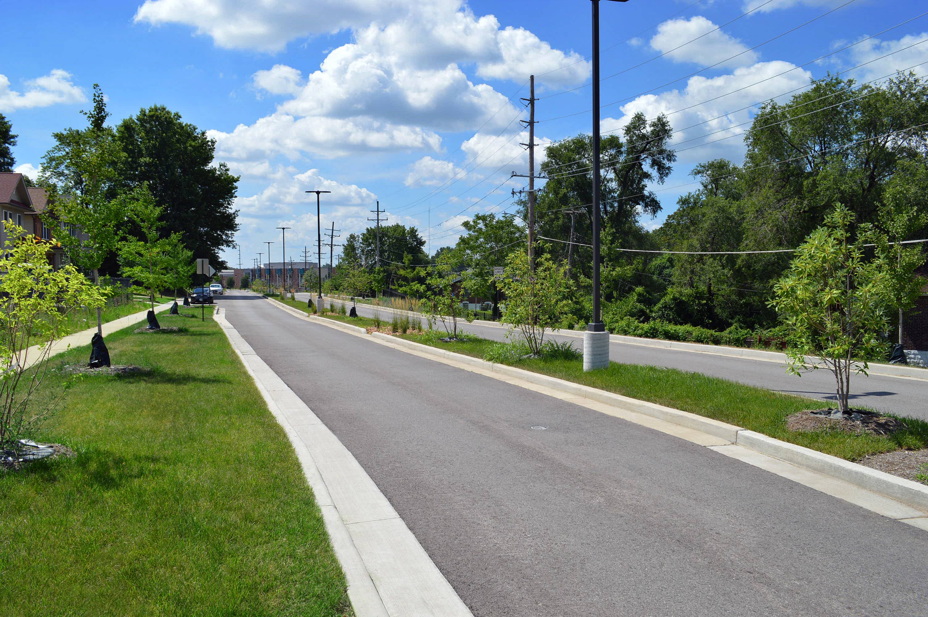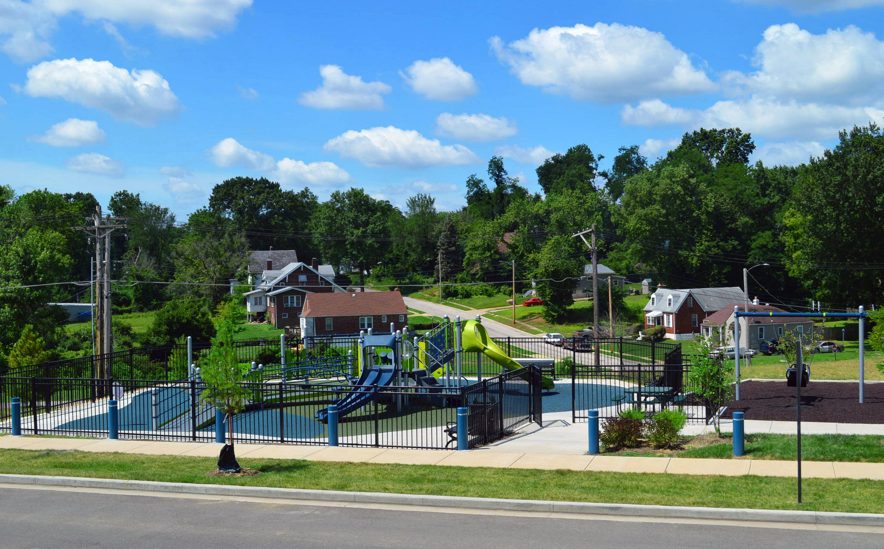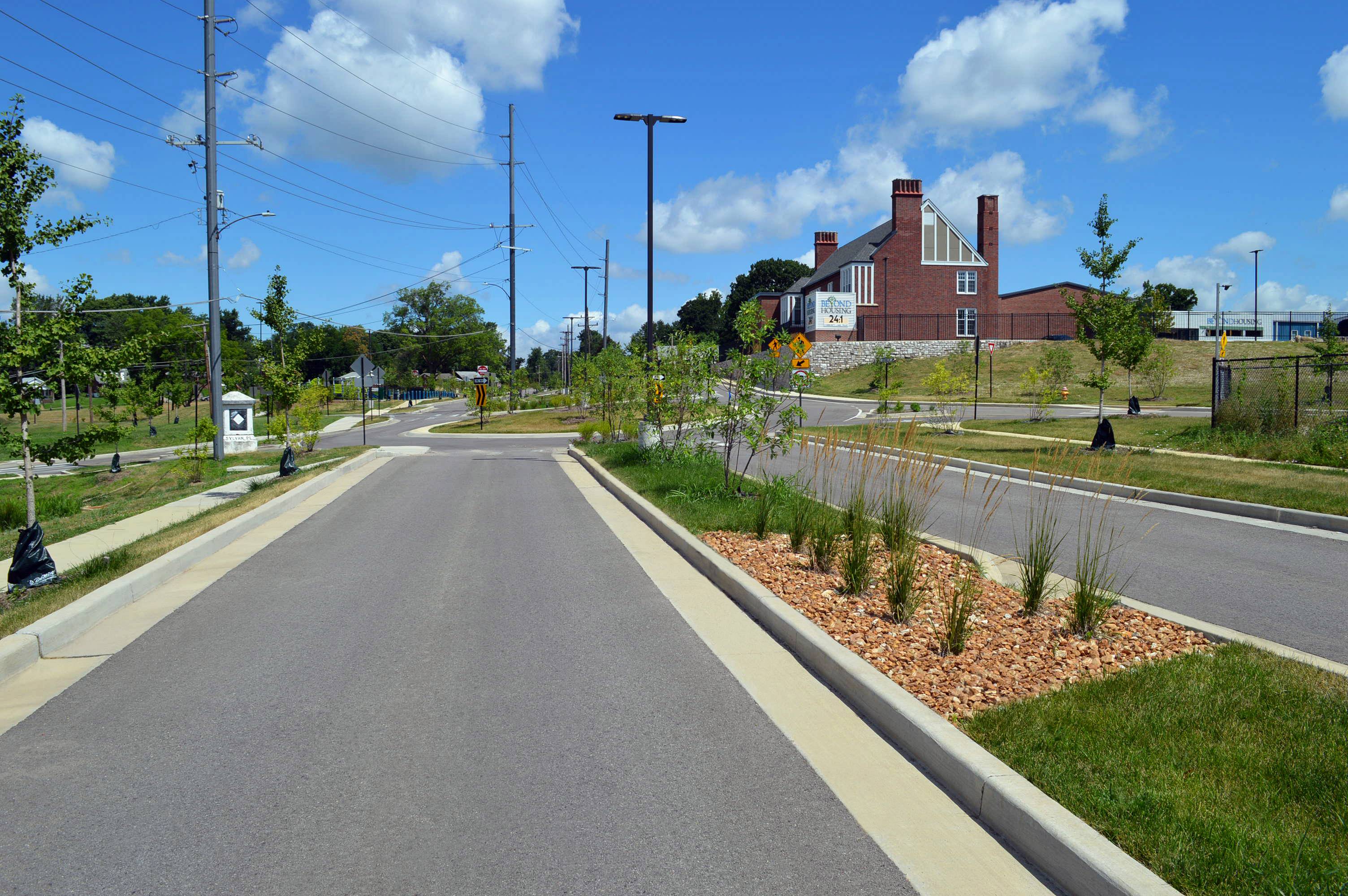 Pasadena Boulevard in the St. Louis suburb of Pine Lawn had a few problems: no sidewalks for children walking to and from the nearby school, vacant buildings, and stormwater runoff. Financed by a grant from Metropolitan Sewer District’s Project Clear program and a private family donation, the Heart of Pine Lawn/Northwoods Pointe public improvements project involved replacement of approximately ½ mile of Pasadena Boulevard and installation of a center median, roundabout, new sidewalks, rainscaping and 9 bioretention areas. MSD's Project Clear program aims to reduce the stress of stormwater on local sewer systems and flooding/sewer backups for nearby homes by retaining water where it lands. Related to this project was the creation of Pine Lawn Community Park, which involved demolition of vacant buildings, sitework, new sidewalks, retaining walls, playground, water fountain, benches, site electric, lighting, fencing, bollards, monument sign and landscaping. The project received the St. Louis Business Journal’s Building St. Louis Awards—Public/Private Project $10 Million or Less category.