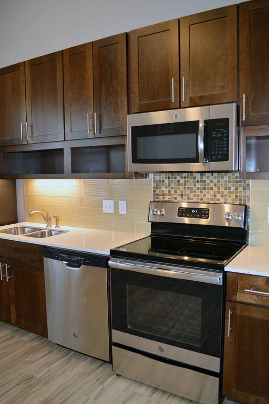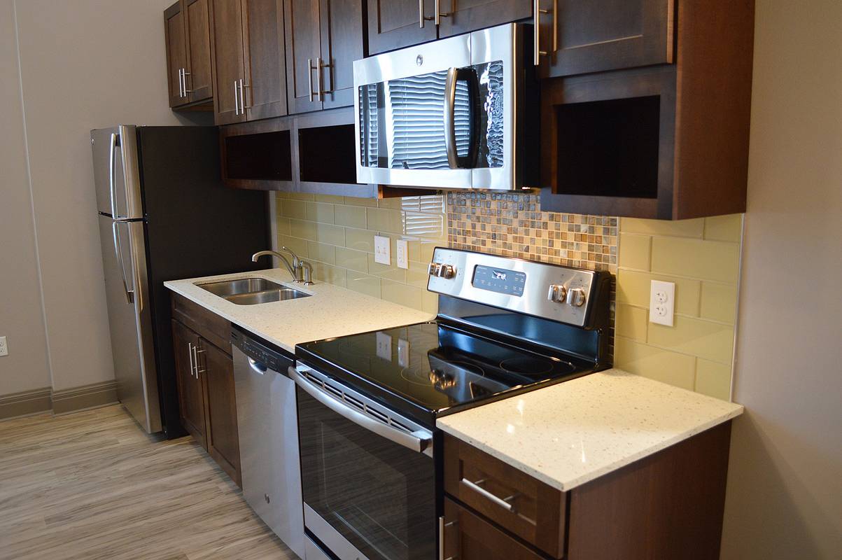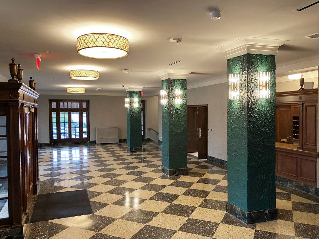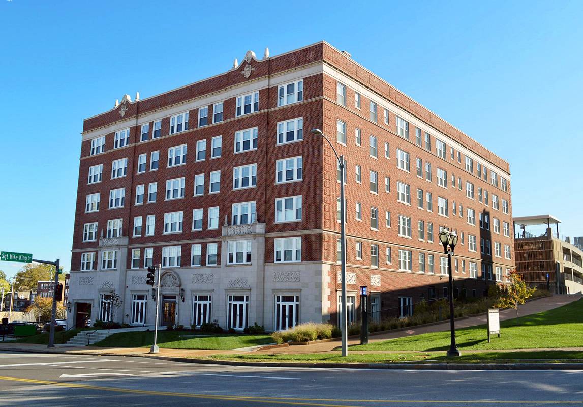 Financed in part by historic preservation tax credits, the Castlereagh Apartments project included the gut renovation of a six-story, early 1900s hotel building in University City’s Delmar Loop for use as student apartments. Renovations included a new roof, new historic windows, masonry and terra-cotta replacement/restoration, hanger rod canopies, aluminum front entry system, refurbished passenger elevator, new freight elevator, mechanical, electrical and plumbing system improvements, carpentry and insulation, restoration of the historic hotel lobby and corridors, new lounge with Luxer Lockers and bike storage rooms, trash chute with trash rooms off each corridor, new flooring, premium interior finishes, and stackable washers and dryers in each unit. Sitework included demolition of a one-story garage, civil work, new concrete parking lot, port cochere driveway, rear patio, walkways, and stairs.